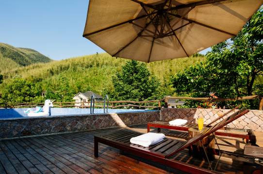 民宿位于莫干山的半山腰中,环境优美、四面环山,空气清新,背后竹海成林,前面小溪流水清澈,是个适合度假休闲的好地方。