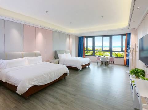 宾馆紧邻大海沙滩,是我住的离大海最近的宾馆,亲子房的房间非常大,孩子是汽车床,在房间里可以直接看到大海,非常干净安静,亲子床可以睡两个孩子,一家四口住都没问题,超级点赞!
