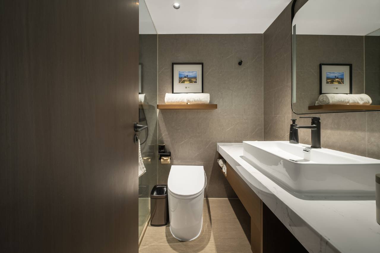 空间布局实用又整洁,30㎡左右的房间毫无局促感,双人书桌和独立衣帽架满足出行收纳与办公需求,浴室干湿分离设计清爽利落,自有品牌"ZMOOD"洗护用品带着清新淡雅的香气,沐浴体验很加分。更难得的是隔音效果,双层玻璃窗和厚重门体把街面噪音隔绝在外,即便临街也能拥有安静的睡眠环境。