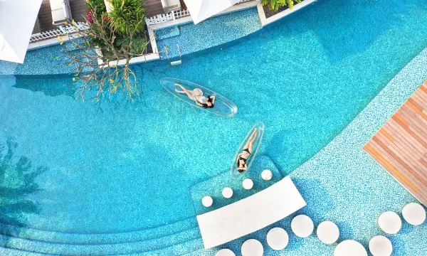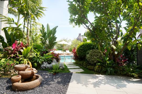 酒店环境更是没得说!整个别墅区 绿植茂盛,郁郁葱葱,仿佛置身于一个 **私密的热带花园**,空气清新,鸟语花香,度假感瞬间拉满。环形游泳池,水质干净,被绿树环绕,保洁员每天都在吸污清洁。