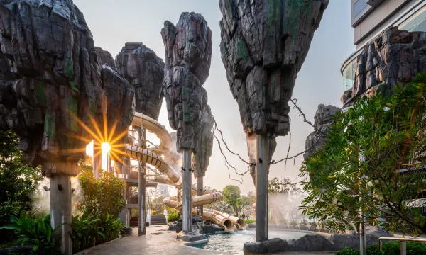 酒店是亲子酒店,非常适合带小朋友来,水上乐园滑滑梯和漂流都好玩,还有免费的游戏房,点餐也不贵,边上就是21航站楼,去21航站楼的路上有很多西餐厅。感觉这一片属于芭提雅比较安全,有序的地方,适合带娃。双条车从步行街过来可以在酒店门口停,很方便。淋浴设备不错,热水很快,也很大,顶楼泳池看落日很赞,有热水池子可以泡。周末来有课程可以上。不足的地方,卫生间下水没有做好,有下水道的味道。我们第一天进去有很浓重的空气清洗剂的味道,后面提供了空气净化器,工作了一天,第二天晚上味道好很多。也许换房间会好一点,房间风景不错,我们就没有换了。入住会有币送,一晚上是2枚,可以兑换纪念品或者吃的,按摩。如果是官网预定币会多一点。