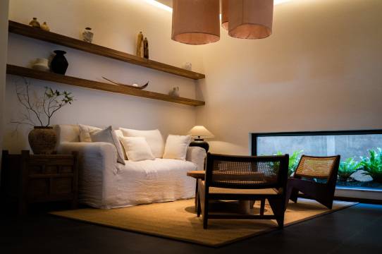 初入庭院,流水、鸟鸣、茶香,细碎的竹影让院子更加幽静雅致。拾步石阶,水塘中的鱼在脚下躲藏嬉戏,静坐于庭,焚一炉香,品一盏茶,看一卷书,此刻起,便远离了城市的喧嚣,静心于乡野自然。