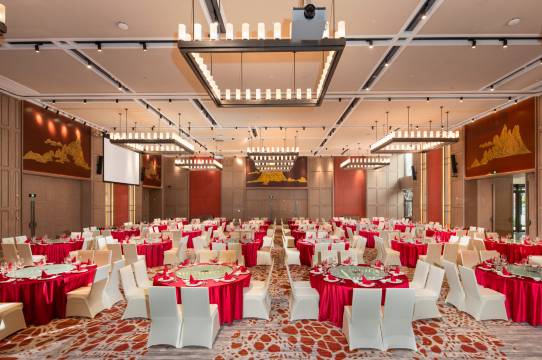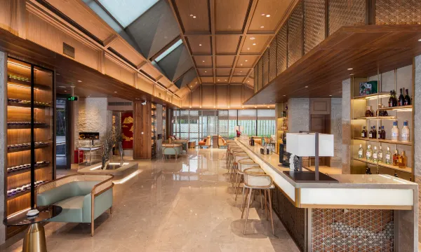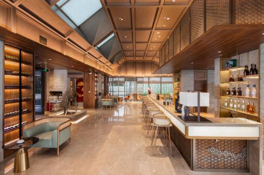 酒店位于龙泉驿东安湖公园,与世界大运会主场馆隔湖相望,项目采用中国园林式建筑布局,主要功能为国际文化交流 中心、会务、接待、展览、住宿等,拥有约750㎡宴会厅,125㎡的会见厅以及三间45-127㎡不等的会议室。南北轴线为酒店仪式序列轴,酒店建筑在南北轴线上点缀会见厅、戏台、休闲亭、水榭、望锦亭等仿古建筑,与酒店建筑形制相呼应。 建筑整体风貌以简约现代中式风格为主,整体建筑群落具有灵动而不失典雅,朴素而不乏精致的现代之美。