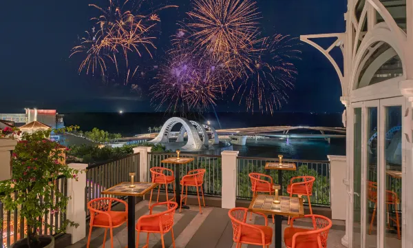 在富国岛日落小镇的绝对C位 酒店海景阳台房看烟火绝了!适合青年男女 。酒店到缆车站和小镇步行街 接吻桥下楼几分钟即到 太方便了 完全建议至少这个酒店住两晚在转到其他南岛靠东岸的度假酒店。酒店服务 、早餐 也非常好。