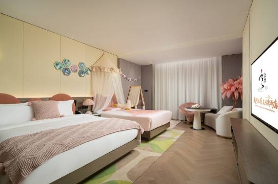 不得不夸奖,天沐温泉度假村前台服务是最棒的,很有新年氛围,设施很温馨,孩子很喜欢恐龙主题套房,有秋千座椅和玩偶,酒店出门右手就是温泉游泳区,干净卫生,工作人员指引到位,有枣茶,小吃,左边几百米就是荷兰花海,很适合亲子周边游。晚上酒店有自助餐,一体化度假很舒适!