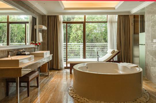 酒店环境漂亮,风景优美。各种设施齐全。房间宽敞明亮,床上物品干净整洁,舒适。早餐品种丰富,服务态度好。温泉区,有多个不同风格,不同温度的温泉泡池,适合各种不同旅客的需求。非常喜欢,下次来一定还住这里。