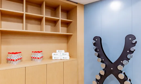 房间设施齐全有小冰箱、消毒柜还有茶具。公共区域有矿泉水无限自取。