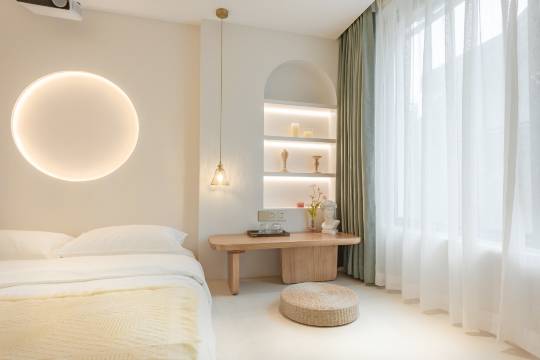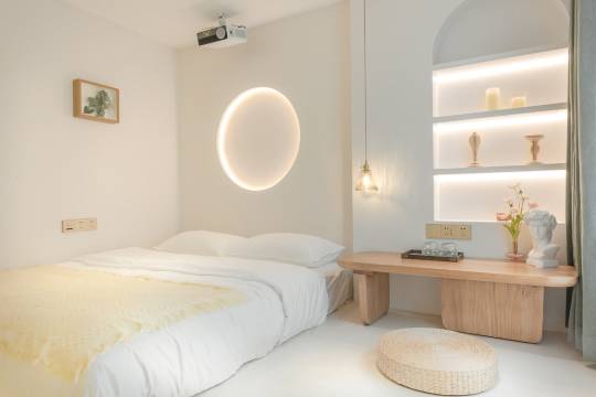 民宿是一栋极简几何的设计空间,空间整体以白色为主,通过硬朗和柔美的线条交叉结合出多种不同的几何形状,使空间整体在各个不同的角度均可以呈现出不同的美感。有趣的是,无论肉眼所见,亦或是相机所摄,在鲸屿民宿你可以随性的加入自己的想象,结合角度、光影以及物件,发现和创造出属于您自己独特的美。