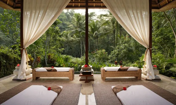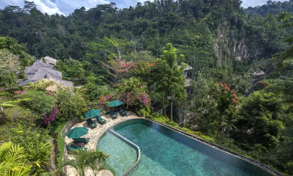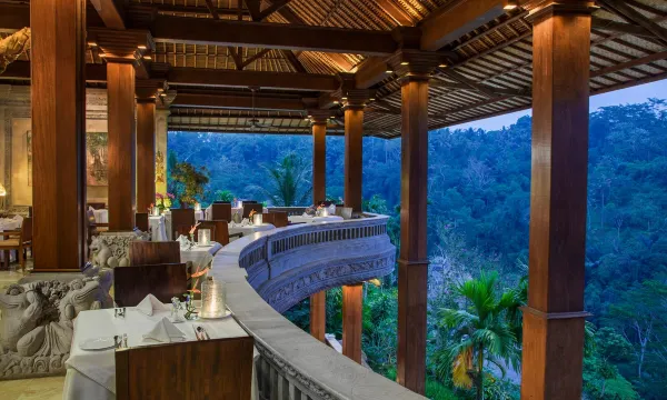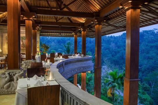 酒店位于乌布的绿色丛林里,很有隐世感。从餐厅和villa里可以直接看到震撼的峡谷丛林景观。阿勇河在酒店下奔腾不息,时不时传来漂流者的叫声。酒店很大,早晚各逛一圈,轻轻松松一万多步。服务周到。