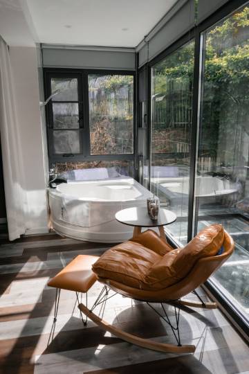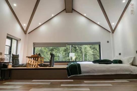 二层是一间套房,有卧室、休闲室、咖啡吧。南有观山阳台,是一亇室外吸烟区。