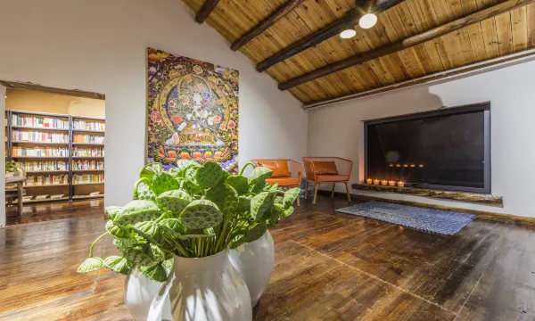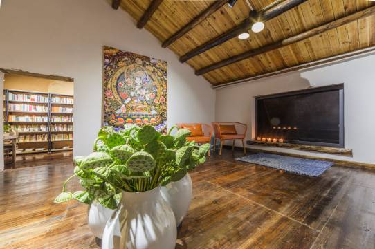 这里是艺术的天堂,餐厅、走廊、房间都有各种风格的画作,油画、唐卡、手绘等各种形式,山水、花树、虫鱼、人物等各种内容,有的娇憨可爱,有的震撼人心。这里专门设置了艺术家的房间与创作室,无偿为有才情的艺术家提供创作和展示的空间,也会举办一些小型画展,让来这里的朋友感受到艺术的魅力。