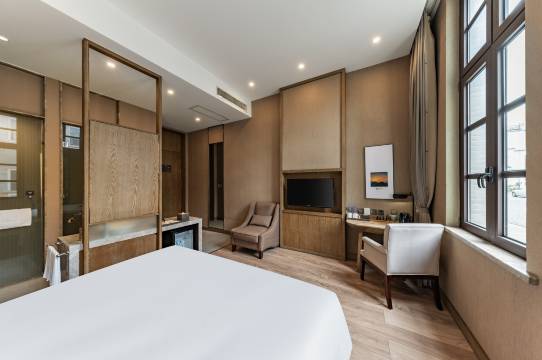 酒店毗邻狼山风景区,距离中南大有境CBD商务区仅8分钟车程,距离南通大学7分钟车程,背靠南通植物园森林氧吧。仿照19世纪初著名的南通南路旧貌原始风格同比例修建,餐饮剧场各类历史痕迹展现,深受摄影行业钟爱。酒店以阅读和属地摄影为主题,高品质的客房产品,温馨细致的服务,带给您“自然、静谧、温暖、朴实”的健康生活方式。客房均采用星级酒店的优质床品、中央空调、全套高端三件套洗浴用品,全WiFi覆盖,全部房型配备冰箱,房间装修低奢素雅。酒店分列街区特色楼栋内,大堂位于城楼脚下,清晨伴有鸟语花香,夜间漫步街区,寻觅独一份宁静。入住酒店本身就是置身特色业态景点,感受专属于那个时代南通传统文化与现代生活方式交互的奇幻感觉...