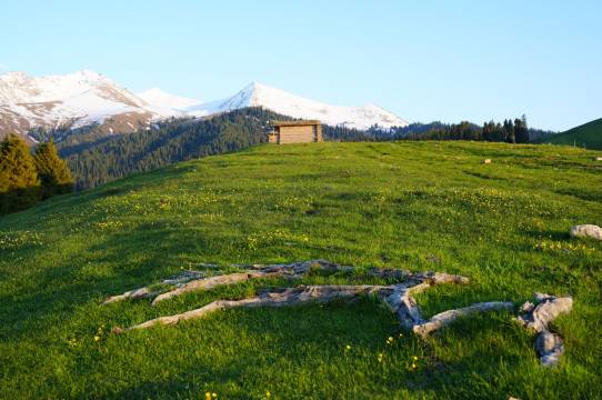 骑马恰巧路过了尚隐,民宿在喀英德库什台的高地,所有房间正对着冷杉峡谷,推窗就是雪山草地森林,旁边就是哈萨克放牧的牛羊马。民宿大门对面正对着又是一个超大的草原,满眼都是牛羊马成群,绝美。