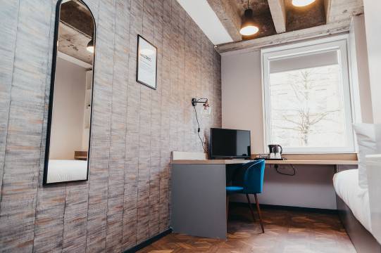 房间有点小,入住的时候进门需要给前台打电话,装修有点工业风,但是地理位置很好,很优越到附近的景点都挺方便的,冬天去的话取暖设备稍微有点冷