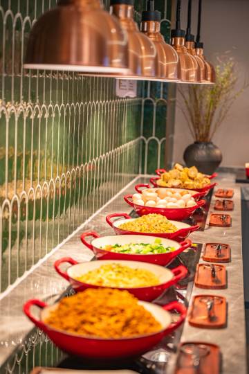 重点夸夸他家早餐🥣 原本以为是普通配置,没想到超丰富!水果新鲜多样,云吞现煮劲道,炒菜口味在线,酸奶、沙拉清爽解腻,果汁、豆浆都是现做的,太幸福啦!