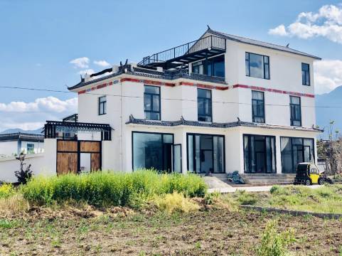 民宿就坐落在苍山洱海之间的白族人居住地龙龛村,外墙自绘的各种图腾图案,三层楼房有很多的空间格局,一层院子里除了小草坪水泥地还有一个宽敞明亮的玻璃钢架厨房,有着中西齐全的调料,专业的冰柜,这是房东提供给房客可以任意发挥厨艺的地方,一层室内除了有当地特色的中堂,还有一个很大的有着四面大玻璃门的空间,这里是客人用餐和活动的地方,咖啡机、超大餐桌,各种精致餐具让人在这个田园小院里惬意的享用早餐。