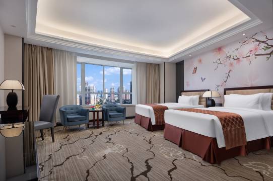 酒店新增尊品城景大床、尊品城景双床、尊享行政套房、尊享家庭套房、尊享棋艺套房,是一家集客房、餐饮、会议室、茶吧、酒吧、KTV、电影院、足浴于一体的综合性酒店,酒店总面积两万平方米,拥有各类精心打造的温馨舒适客房,每间客房面积均在35平方米以上,入住宾客可享受到一系列尊贵服务,如大屏网络电视、无线wifi、宽带上网、智能窗帘、订制版洗漱套盒、中央空调、冰箱、提供免费停车、部分房间设有负氧离子空气净化器,同时提供贴心且性价比高的管家式服务。多样化房型满足客户多元化需求。餐厅为现代明朗简洁风布局。同时为迎合客人的不同需求和自由选择,为客人提供多元化自助式早餐,如湖南常德特色米粉、中式糕点面点类、热菜、凉菜、饮品等。让阁下全方位品味中式饮食文化精粹,倍感轻松惬意。酒店以其便利的交通、幽雅的环境、高雅的格调、齐全的功能、优惠的价格、优质的服务成为广大宾朋商务、旅游、会务、娱乐的理想处所。