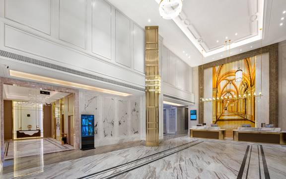 大堂宽敞明亮酒店前台服务态度好,还会递送热水房间的话卫生干净,还有智能机器人送物