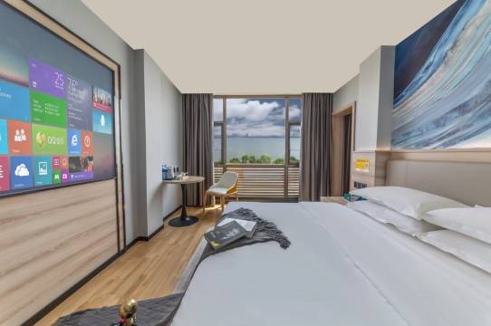 酒店落座于莲花湖边,夜景非常漂亮。是一家智能型的酒店,有智能机器人服务,自助入住\退房,房间设备大到空调、马桶,小到窗帘、灯光都是语音控制,在房间里有种躺着撑控万物的科技感。