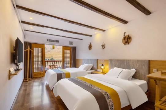 嘛推荐大家来这里的 酒店环境特别棒 房间都有阳台 晚上吹吹晚风还是嘛舒适的 晚上有蛙鸣声 鸟叫声 早上起来推开阳台门就看到很美的梯田 一整天心情特别棒 很喜欢这种氛围 并且酒店每层楼都有个公共阳台 沙发 几个朋友坐着聊聊天吃吃东西也很舒服 交通也方便 坐车到风雨桥后直走一段路就到了 并且老板也很热情 这家店值得!