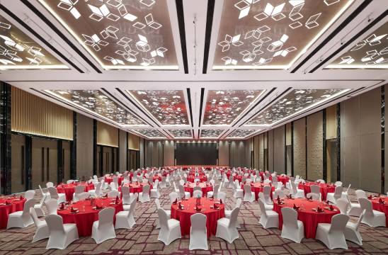 酒店拥有各类客房及套房,近1395平方米会议功能区域,含5个大小不等的宴会厅及多功能厅,无柱式大宴会厅,方正布局,挑高6.6m,配套内置式52平LED,可容纳60桌大型宴会 ,并配有专属汽车进入会场通道。