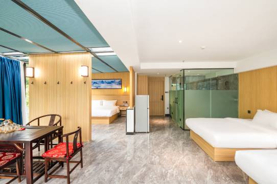 房间很大,非常舒适,两张1.5米的床,适合大人出行。房间设施齐全,环境很好,早饭也不错。离桃花谷景区很近,晚上去村里吃饭,超市买东西,都很方便。