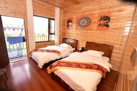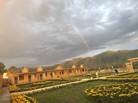 离唐布拉百里画廊车程半小时,周围有几家小饭店,如果想去饭店多的地方需往前开十五分钟。旁边的酒店在携程上定不了,条件差不多的只要二百一晚,价格偏贵,无早餐,对面有马场。
