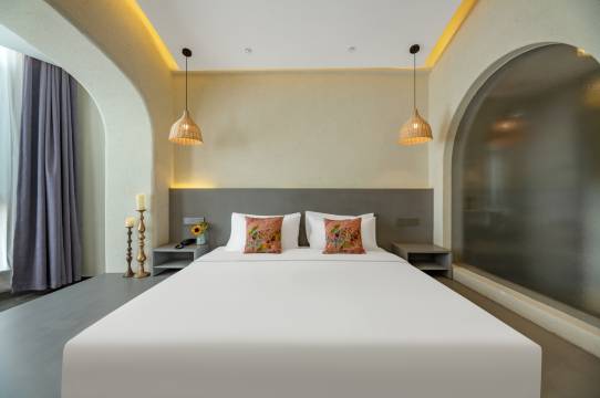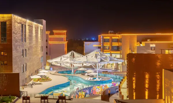 漫心酒店吐鲁番悦丰文创基地店是华住集团旗下中高档品牌酒店,位于高昌区火焰山路湘潭葡萄公园旁的悦丰民宿文化创客基地园区内。酒店采用地方特色的赤色外墙配合几何造型展现了浓郁的历史文化气息。客房采用漫心品牌订制客用品,配备自助入住设备、智能机器人、智能音箱、智能马桶、电动窗帘、加湿器、小冰箱等多种非接触服务设备和智能客控;有多种房型的大床和标准房并有亲子家庭房,部分房型有露天阳台及浴(泡)池。酒店所在园区内配有新疆特色宴会厅、住客免费的露天游泳池、下沉广场式酒吧、民俗文化博物馆、咖啡厅、超大停车场等业态。