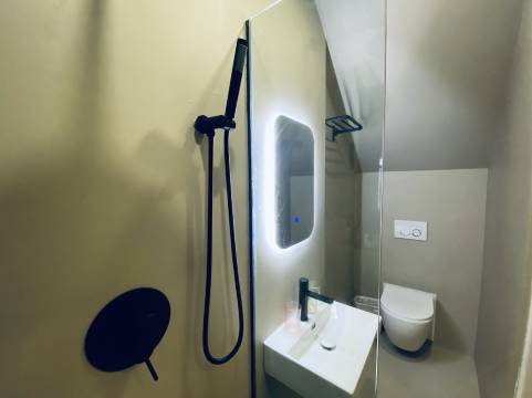 独立卫浴超干净,黑色极简花洒搭配纯白马桶,舒适度拉满~ 床品软乎乎的像陷进云朵里,一夜好眠不是说说而已!书桌、空调这些日常设施也超齐全,完全不用担心住得不舒服,颜值和实用双在线!
