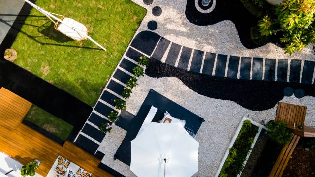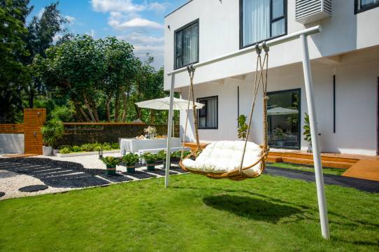 石子小院很有氛围感,有秋千和露营椅
