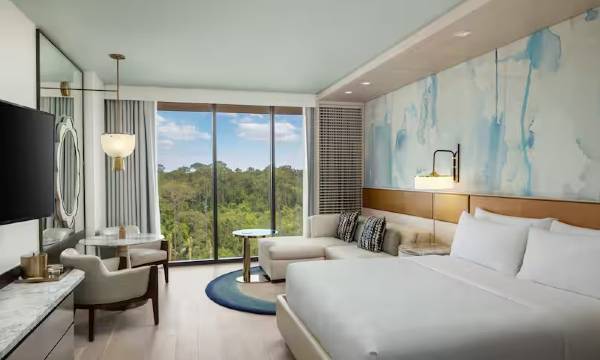 很新的度假酒店,房间里设施很新很干净,室内空间也很大,早餐品种丰富可以点餐或者自助。院子里有很大一片湖,很多水上项目可以免费玩,距离迪士尼乐园很近,有免费穿梭巴士接送,下次去了很会选择入住。