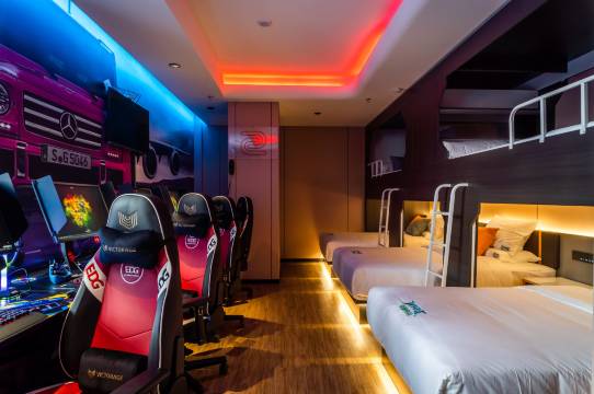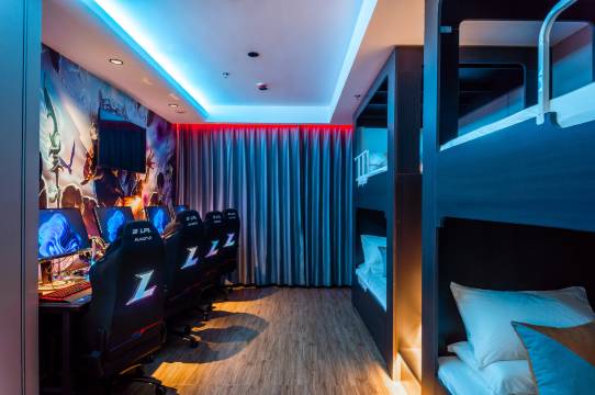 酒店设施设备齐全,装修酷炫奢华,融赛博朋克科技感和现代时尚电竞场馆设计风格为一体。酒店装修前卫,风格各异的各类主题精致客房。结合电竞娱乐玩家需求,比赛、开黑、电竞周边等都是品牌持续探索的目标,结合酒店与电竞,给客户提供定制化服务,增加客户娱乐体验;专业的酒店从业人员与培训体系,秉承体验至上的服务理念,悉心呈现,给客户尊享感受;对于环境、卫生、沐浴、床品、硬件等提出高品质要求,让客户身心舒适;酒店的研发团队在创新的道路上不断探索,让电竞酒店不断发展提升、迎合客户需求;酒店将在电竞酒店领域勇往直前,创新致远!