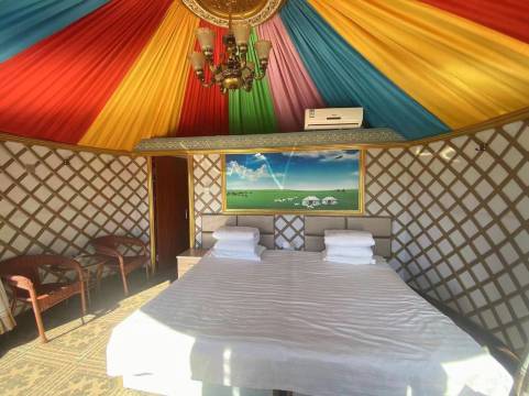 度假村独特的设计,采用钢架结构,中夹保温板,外墙柔性腻子,内壁石膏板密封,壁纸与壁画完美结合,顶部采用蒙古特色丝绸及仿古顶灯,专显蒙古元素,给每一位顾客不一样的感受,达到旅游的目的,愉悦心情,放松心态的目的,欢迎各位朋友体验!
