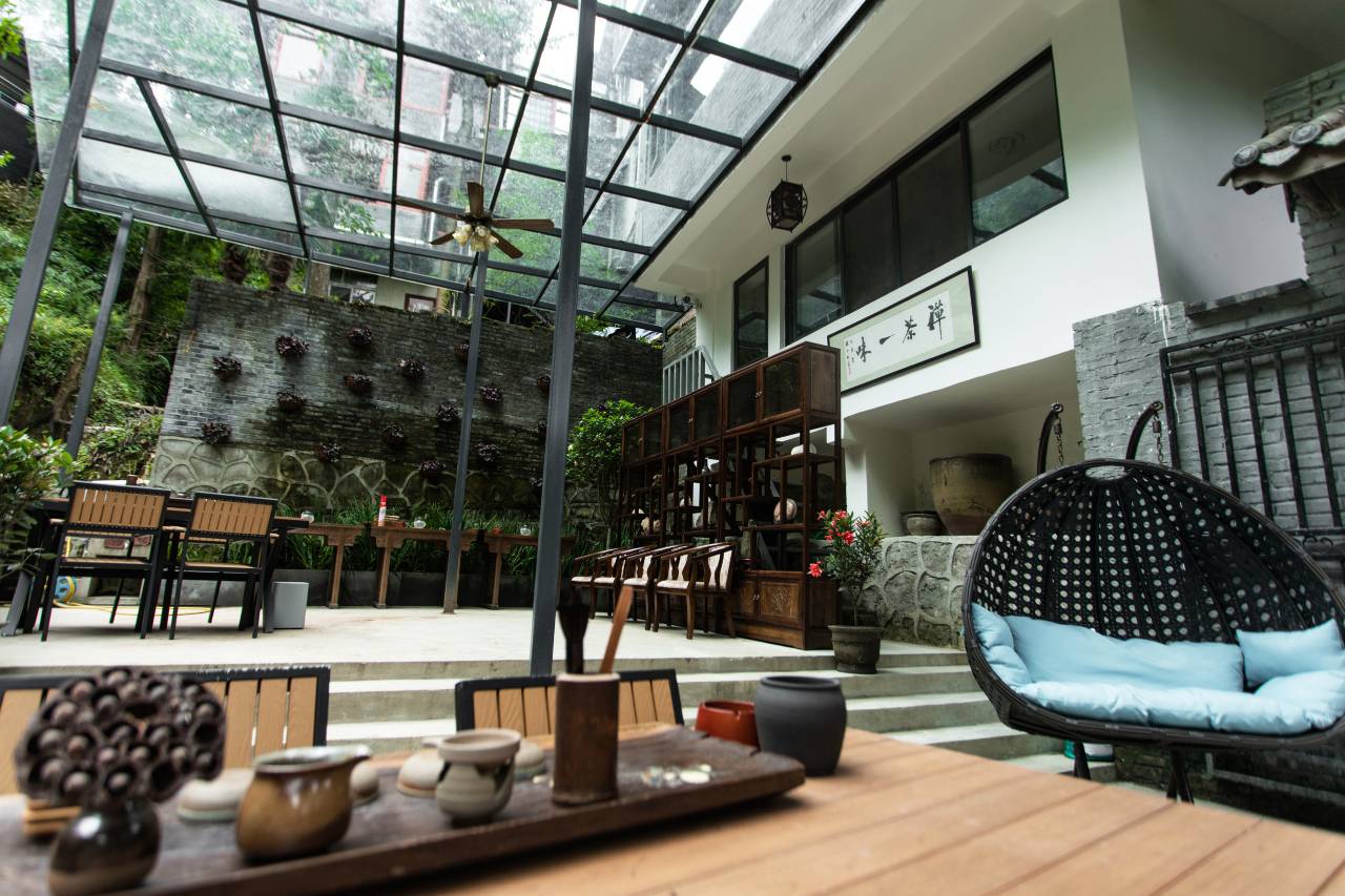 藏于青城后山泰安古镇旁的一家古风民宿, 以青山为屏,以溪水为带;庭院被参天大树覆盖,住在了院仿佛置身在森林之中,民宿有九间不同的房型,上下两层,每一间客房都有不同的风格,而且还有180°全景房,让你感受次日清晨,晨光叫醒的柔美;庭院离泰安古寺不远,步行8分钟,在这里你可以卸下浮躁,感受晨钟暮鼓,鸟啼蝉鸣的宁静之美;也可以与志同道合之人在庭院品茶论道,挥笔作画,感受归隐山林之乐;风起时,笑看庭前花开花落,风停时,坐享窗外云卷云舒;淡看天边,了然于心,懂得放下,人生最美的风景,就是你内心的从容与淡定......