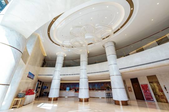 精河迎宾馆作为一家星级园林式豪华宾馆,集客房、餐饮、商务会议于一体。主体建筑9层,地上八层、地下一层,总建筑面积近1.5万平方米,拥有豪华套房、商务标准房、标准单人房,其整体设计格调高雅,风格别致,功能齐全。拥有两部观光电梯,可直达七层,远眺精河景观;四根大理石柱横贯主体大厅,彰显恢弘气势;总台背景以金秋胡杨景观为底色,壮阔大气。总台分接待收银两个总台,能快速办理客人入住手续和提供咨询服务,还提供贵重物品保险柜和行李寄存服务,真正做到让客人宾至如归。休闲场所,有茶室、接待室、咖啡机,也能为客人提供牛排等西餐菜品。休闲区还配备有电子智能钢琴,能自动播放贝多芬、肖邦等钢琴家的经典曲目,格调高雅、氛围轻松惬意。大堂吧还摆放有“精河礼物”系列商品,努力做到知责于心、担责于身、履责于行,为积极推动精河旅游商品、纪念品市场繁荣发展贡献自己的一份力量。早餐区采取的是自助形式,能同时满足88人的用餐需求。后堂明厨明档,主厨来是来自全国各地的国家高级烹调师,厨师团队包括中餐厨师、西餐厨师、西点师,可以提供130余道菜品,囊括西点、糕点、凉菜,还提供煎牛排、特色小笼包等,能有效满足不同口味、不同餐饮习惯的客人用餐需求。岛台上方设计了360度环形分块液晶显示屏,循环播放自然景观、酒店新式菜品等。宴会厅,设有梯台、多媒体等设施设备,能够容纳120余人,承担着婚宴、商业推介会等功能。中厅水系景观区。池中荷叶荷花点缀,水气潺潺,背景墙三两笔勾画出远山和树木轮廓,景观整体错落有致,搭配相得益彰。会议区:1号是小型会议室亦可用于接待室;2号是多功能、高规格的多媒体会议室;3号是多功能房间,即可当会议室,也可以作三连包使用;4号和5号会议室规格相当,会桌式能容纳120人,剧院式能满足200人的会议需求。房间内部在软件上每个房间都配备了小度智能语音系统,给到客人全新的智能化体验。在硬件上科勒、华艺等一线洁具,希尔顿、万豪等酒店通用的美国金可儿床垫,人性化上还配备小冰箱、座机、精巧闹钟、高速WiFi、干湿分离等,充分满足客人舒适、有格调的住宿体验。酒店大堂水晶星河灯和乌鲁木齐新地标乌鲁木齐文化中心(即六馆一心)的主灯规格相当。该灯横贯5层,长约15米,巨大体量的水晶穿梭在灯带中形成恢弘气势,开启后结合光与影的艺术,打造出浩瀚的灿烂星空。也展示着精河这座千年枸杞之乡,历史和当下,古典与现代,由内而外焕发璀璨夺目的光芒。在此精河迎宾馆全体员工,竭诚欢迎您的光临!