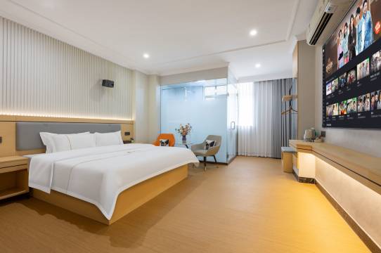 前台工作人员热情友好,办理入住手续高效快捷,还贴心地为我们介绍了酒店的各项设施和周边景点。房间宽敞整洁,布置得温馨雅致。床品柔软舒适,让人一夜好眠。投屏影音效果非常好,超大屏幕,追剧看电影都很过瘾,全程没广告。房间内的设施一应俱全从高品质的洗浴用品到便捷的充电设备,处处体现着酒店的用心。前台小姐姐,超级好看🥰🥰