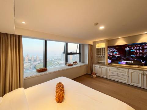酒店位于大连最中心地标地段,星海广场附近,步行至星海广场只需10分钟,在房间里即可俯瞰并且望穿整个星海广场,当然作为一线海景房,大海的壮阔与跨海大桥的优美也都尽收眼底。酒店内有全智能家具设施与小爱同学互动可以控制灯光,窗帘等,房间以轻奢设计时尚为主,由于店主是米粉所以大部分电器均为米家产品,房间均配备激光投影仪,高清巨幕给您带来电影院的震撼体验。周边服务设施配套齐全,饭店,超市,KFC,星巴克就在楼下,停车服务也方便,周边也有商场,楼下即是地铁站交通十分便利。