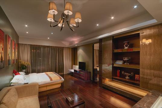 房间布局温馨舒适,木质家具质感柔和,墙上的装饰画增添了不少艺术氛围。卫浴区域干净整洁,大理石台面和镜面都一尘不染,洗漱用品摆放有序。最惊喜的是房间里还配备了小厨房,微波炉、水槽一应俱全,临时想热个餐特别方便。床品柔软亲肤,一夜好眠到天亮,服务也很贴心,下次来还会选这里!