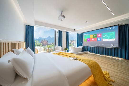 酒店非常整洁干净,房间空间很大,环境不错。玻璃落地窗和投影都很有氛围感,设施和星级酒店不相上下。酒店服务员态度特别好,主动帮提行李,有问必答。房间网络一直连接不上,直接给更换了房间。