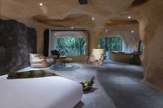 洞穴的房间岩石肌理,搭配现代轻奢软装,野奢感十足,恐龙蛋造型马桶超有创意。