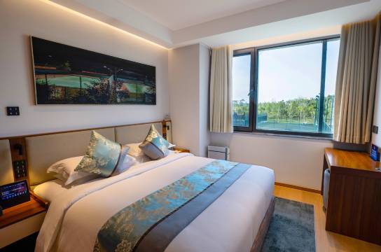 酒店入住环境绿意盎然!酒店共设有5个房型,客房面积从21㎡至53㎡不等,入住每一间客房,都可以将绿心美景尽收眼底。酒店专门设置了家庭套房,打造了“相约绿心”旅游线路,在满足商务差旅、休闲度假、运动爱好者需求的同时,为亲子家庭提供度假游玩的新选择。步入酒店,绿色、运动、阳光、活力的度假气息扑面而来。酒店整体装修风格以网球运动为主题,以绿色活力为主基调,与绿心公园相映成趣,为每一位尊贵的客人打造舒适、松弛、小隐于市的别样度假体验。