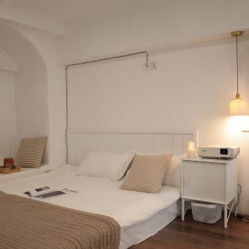 细节:房间里的小冰箱、复古灯具、飘台坐垫都很用心,床品柔软干净,住得很舒服。