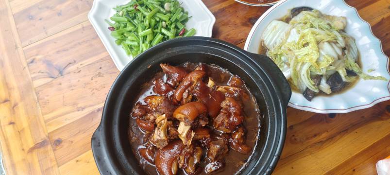 房间超出预期的棒,就在聚龙后面,算是景区里面了,屋里设施赶得上星级酒店,看得出来老板在很用心经营。预定的房间在一楼,有个大落地窗,外面一片绿色,正好傍晚赶上一场暴雨,很有意境。老板做的菜很不错,尤其烧鸡,孩子爸爸平时不爱吃鸡肉的,也夸着说味道很好。第二天又点了臭鳜鱼,也好吃。