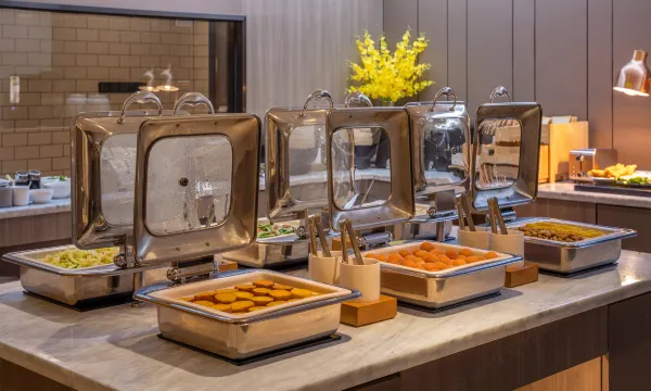酒店的早餐也是一大亮点,种类丰富得让人眼花缭乱。热菜区有各种美味的炒菜和炖菜,色泽鲜艳,香气扑鼻,每一道菜都让人垂涎欲滴。凉菜区则摆放着各种新鲜的蔬菜和水果,色彩斑斓,清爽可口,为我的早餐增添了一份健康和活力。主食区有面包、馒头、包子、油条等多种选择,无论是喜欢中式早餐还是西式早餐的客人,都能在这里找到自己喜欢的食物。此外,酒店还提供了各种饮品,如咖啡、牛奶、果汁等,满足了我不同的口味需求。每天早上,我都会在酒店餐厅享用一顿丰盛的早餐,为新的一天注入满满的能量。