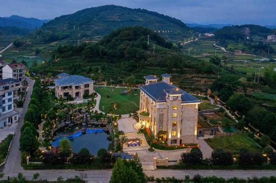 酒店占地总面积为九千平方米,总建筑面积为三千平方米,建筑风格典雅,尽展雍容华贵的气质。拥有精致舒适的各类客房,客房内装修采用先进的全屋智能化设备设施。一楼二楼各具特色的中西餐厅包厢尽显时尚简约风格,二楼会议室配有全套先进设备的会议设施,可满足不同会议活动的需要。园区内设有草坪花园、亭台楼阁、瀑布水景、热带泳场、水果采摘、酿酒品茗、客房、中/西餐厅、会议室、影视厅等各类休闲娱乐场所。酒店主楼西边为西餐厅主题,和户外的泳池休憩露天平台连成一体,与几步之遥的绿茵草坪形成了一道完美的风景线。