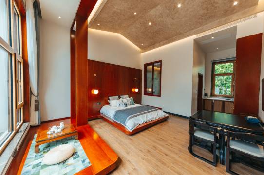 民宿位于盖州市双台镇,整个民宿如同一个小型的苏州园林,一年四季处处都是风景!取自地下纯天然原浆温泉水,让每一位客人享受饱含矿物营养的温泉浸浴。民宿包含特色主题房和全景亲水房,其中特色主题房均搭配专属独立小院,可享户外独立私汤。所有房间整屋全实木装修,铝包木门窗隔音效果好,中央空调,新风系统,房间配备小冰箱,美国舒达床垫和泰国乳胶床垫,配备泰国乳胶枕和高级鹅绒被,大大提升睡眠舒适度,天然岫玉可加热的地台,汉斯格雅花洒,智能马桶,玫瑰岛浴屏,唐汇整体软装设计,每一项只为让您享有更舒适的居住体验,让您在东北地区也能享受到苏州园林般的美景!无论是朋友联谊、家庭聚会、或是情侣约会,都能在这里邂逅最美好的时光。