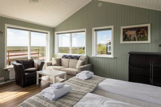 这真是一个宝藏之地。一踏入酒店,就感觉像回到了家一样温馨。房间很舒适,浴室也一尘不染。从每个窗户望出去,景色都美得令人惊叹。包含在内的早餐非常棒,能满足所有人的口味,有新鲜面包、冷切肉、冰岛酸奶和谷物、鸡蛋、香肠和培根。我们一边喝着咖啡,一边透过窗户看着马儿,享受了一顿丰盛的早餐,简直是人生一大乐事!真希望我们能多住几天!