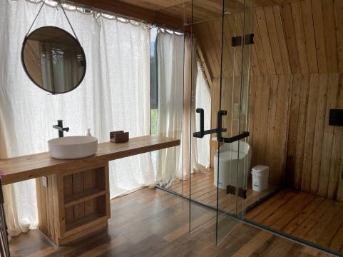 非常喜欢这家房车酒店,用品考究有品位,房间整洁,卫浴舒适。酒店有自己的生态小岛,有羊驼和羊,房车旁边就是chu河,晚上喝茶看星星听潺潺流水,很有意境。儿子预定的 非常满意