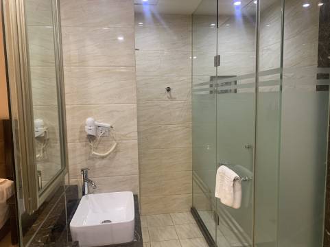 这个酒店是真不错,订的套房,能睡四个大人,有两张单人床和一张大床,两个厕所其中一个带洗澡间并且干湿分离。里面卧室有空调,空调位置不错,不怎么吹人。酒店卫生做的挺干净的,物品和矿泉水每天都会给续上。可以订外卖,有机器人送到房间不用下楼去拿。酒店位置好找,离医院很近,就在大路的边上。周围有公交站地铁站。