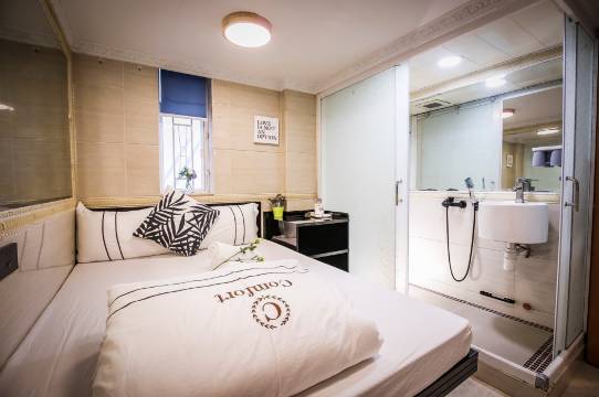 地点在尖沙咀繁华地段,出来有巴士站,附近吃的和购物非常方便,30分钟生活圈就能步行到天星码头,维多利亚港,公园,Bakehouse,科学馆,地铁站等,会省下一笔交通费。订的是3人2床房,房间在6楼。要先去14楼,门外有电话可以联系,然后有外国人的婆婆带路去房间,她会说英语和简单的粤语,交代注意事项。房间收拾的干净卫生,是白色床单白色枕头,是房中房,每天都洗被单和床罩,可以放一个大的行李箱,多的就放不下,洗手间比较小,毕竟是香港寸金尺土的地方,凑合着也行,性价比高。下次来也订这里的。
